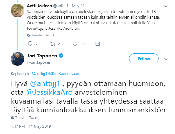 KIITOS https://t.co/MlPwDuZyvO— Jessikka Aro (@JessikkaAro) May 11, 2019